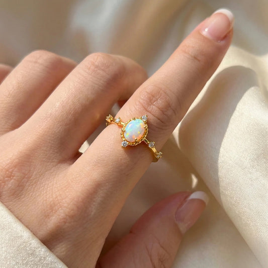 Aruale Joyas Anillo Vintage Plata Ley 925 Chapado Oro 18K Ópalo Blanco Circonitas