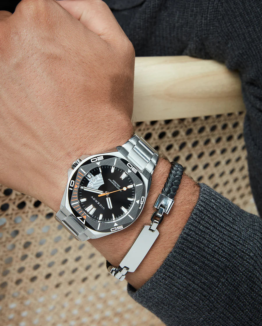Men's bracelet crafted from stainless steel with a black IP finish, combined with black braided leather for a stylish and timeless contrast. It features a central steel plate that adds a distinctive and modern touch. The mix of materials creates a robust, versatile piece designed for stylish everyday wear.