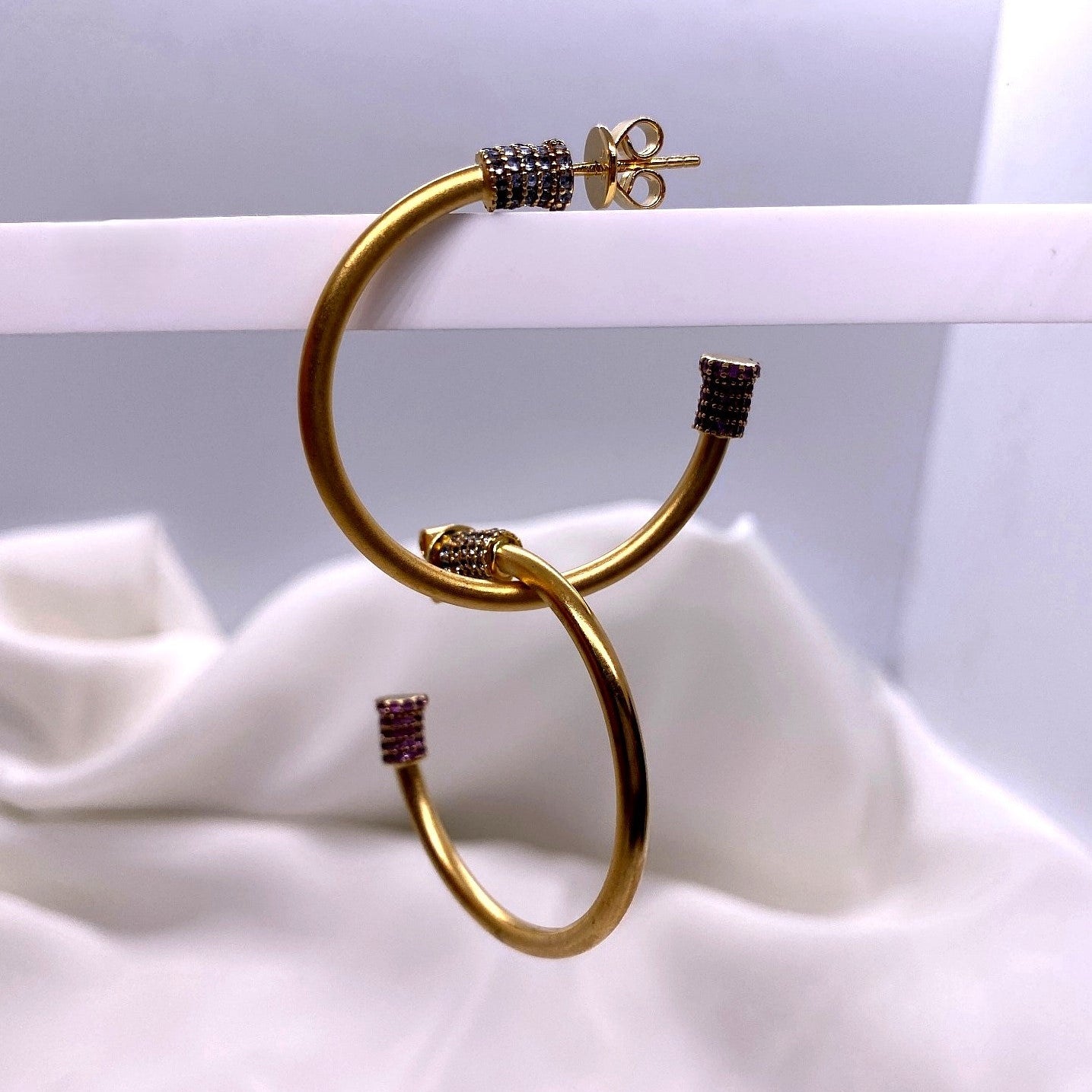 Aros semiabiertos de plata de ley 925 con acabados de circonitas de colores con chapado de oro de 18K de la marca Salvatore.