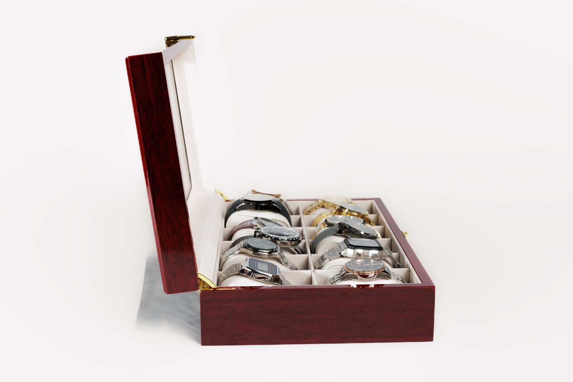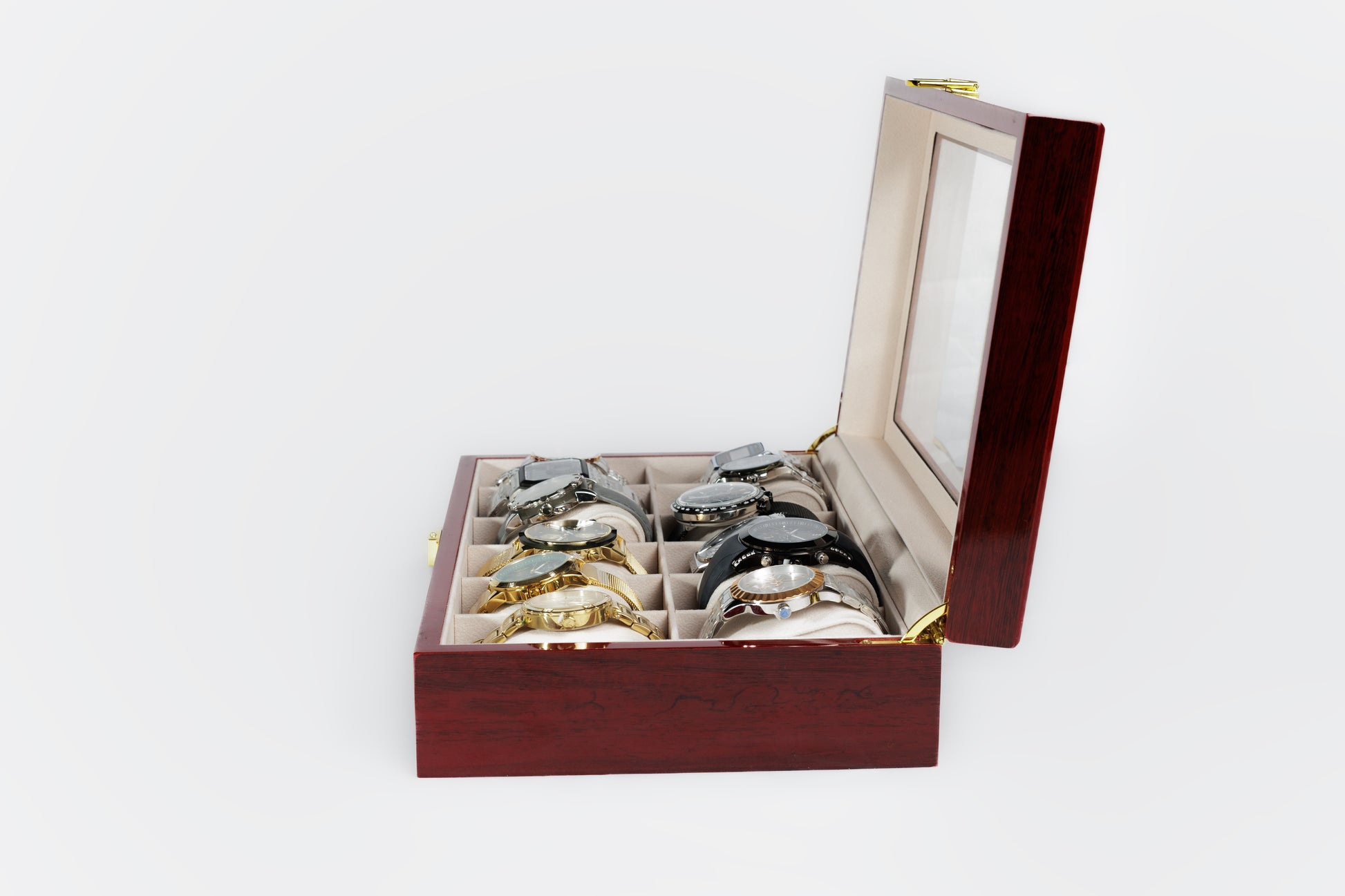 Con un acabado profundo en madera color caoba y un brillo de alta calidad, esta caja no es solo un accesorio de almacenamiento, es una pieza de exhibición.
