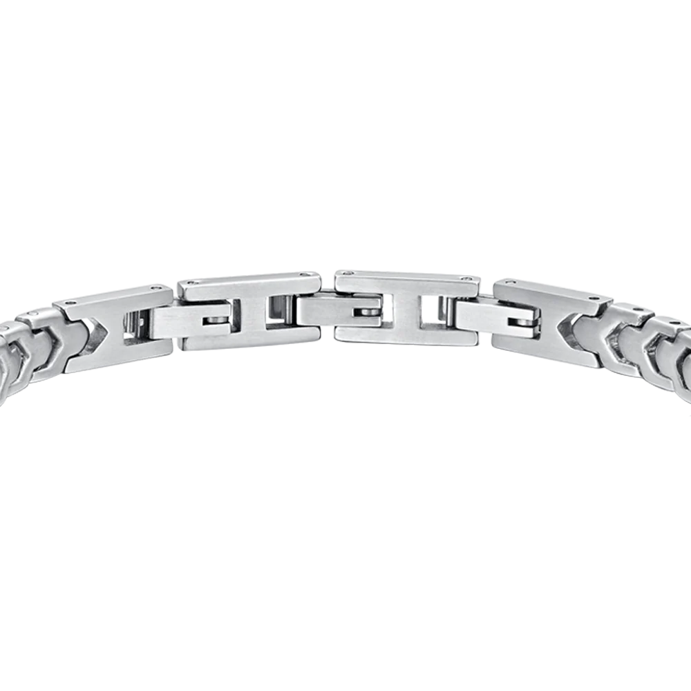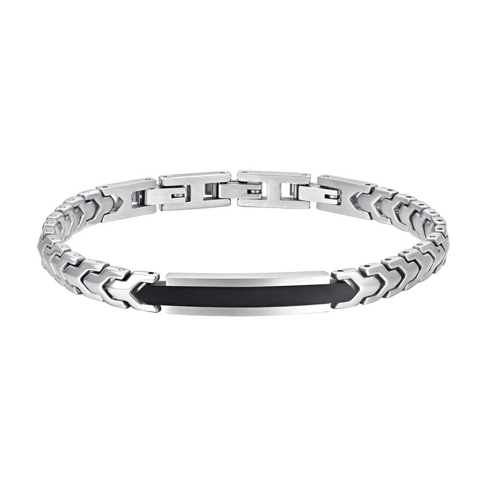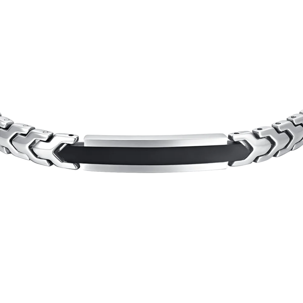 Pulsera de acero inoxidable con acabado en IP negro, diseñada para un estilo moderno y versátil. Longitud de 21,5 cm, cadena de 6 x 3 mm y placa de 34 x 6 mm. La combinación de acero e IP negro aporta un toque sofisticado, ideal para cualquier ocasión, mientras que el color negro transmite elegancia y carácter.