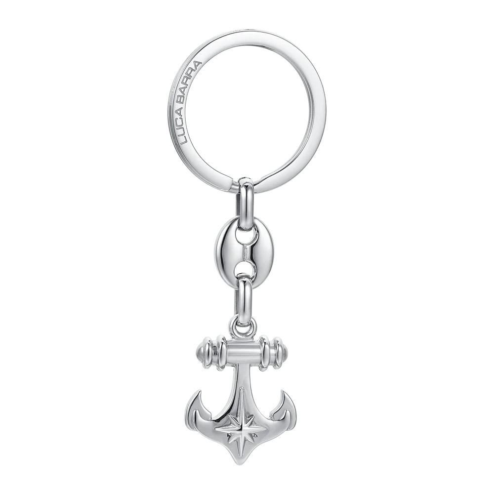 Llavero de acero inoxidable con diseño de ancla y Rosa de los Vientos. Longitud total de 7,5 cm y tamaño del ancla de 28 x 20 mm. Un accesorio resistente y simbólico.