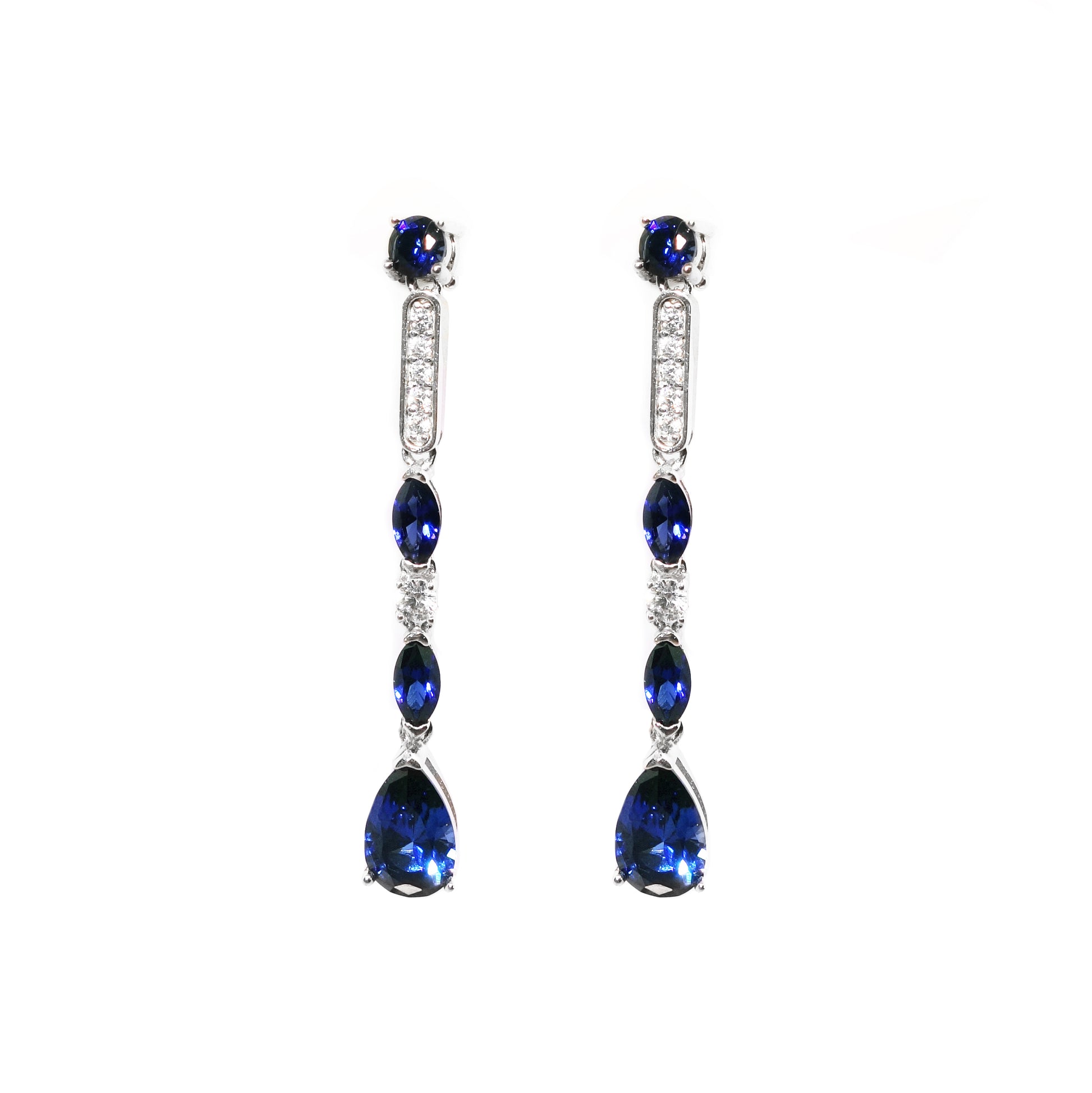 Pendientes de plata de ley 925 con baño de rodio. Diseño en tira con circonitas azul zafiro en talla pera y marquesa, combinadas con circonitas blancas brillantes.