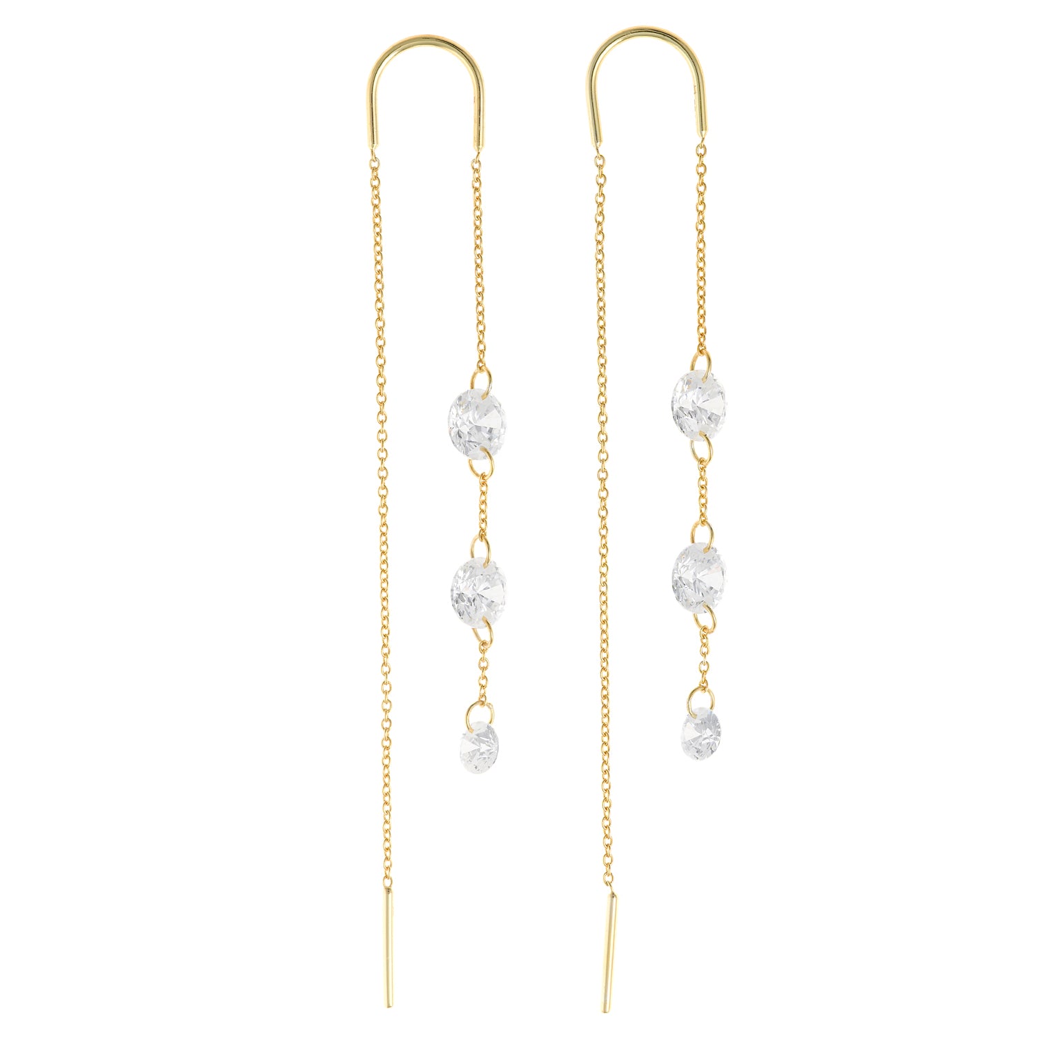 Pendientes de Plata de Ley 925 chapada en oro con diseño de cadena fina y tres circonitas blancas brillantes en caída. Cierre tipo hilo pasante.