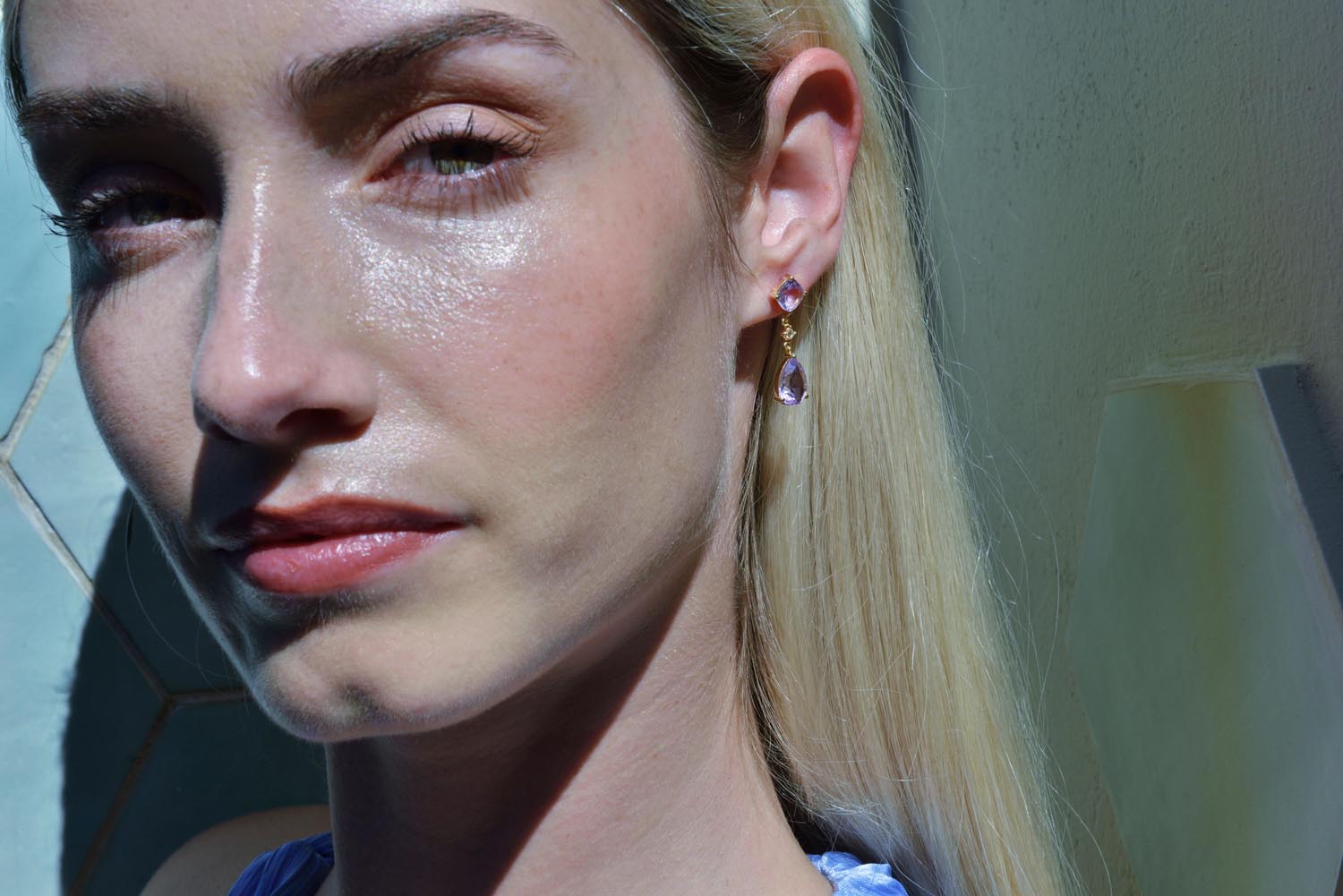 - Piedras: Amatista facetada (cuadrado y pera), topacio blanco brillante