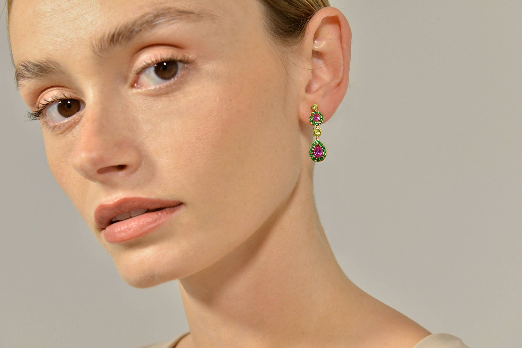 - Piedras: Rubí sintético ovalado, peridoto, nano verde sintético y piedra en talla pera